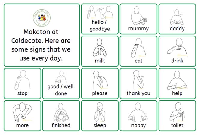 At Caldecote Day Nursery, we use Makaton as part of our daily communication with children. The poster below shows the most common signs that we use with children on a daily basis.
